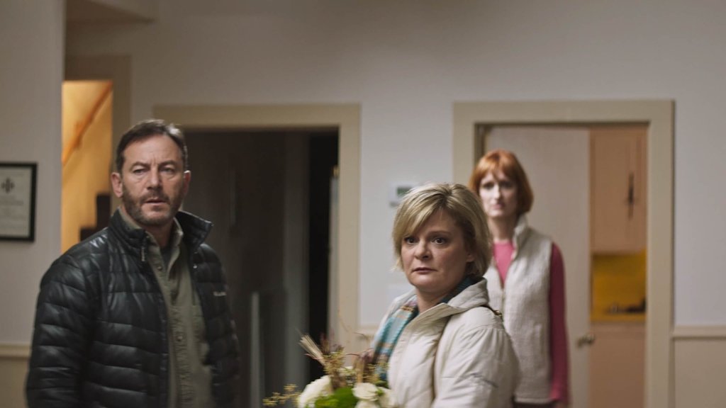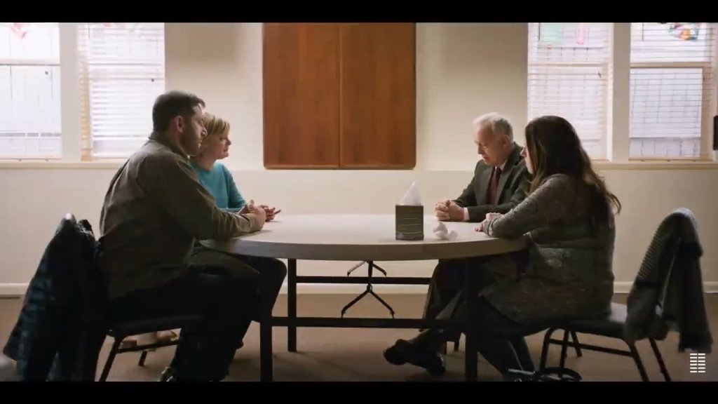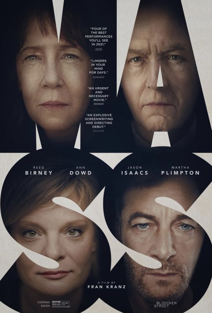 Mass follows two couples played by Jason Isaacs, Martha Plimpton, Ann Dowd, and Reed Birney who assemble at a church to discuss a tragedy at a local high school. They discuss the mental state of their children and the accessibility of guns in their community. Who’s to blame in this pointless tragedy. And how do they fit into the decisions of their children? Are they fit parents or not? These are all the questions this film asks and answers while these four people are sitting at a table in a room at a church.