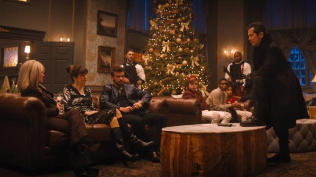 This movie is a mix of holiday spirit mixed with a straightforward action film. The action is a mix of tried and true scenes of Harbour doing his thing using whatever is on hand to defend himself against the thugs robbing the house. Including a sledgehammer that gets pretty bloody from all the heads, it smashes in. Also, a scene where the young girl channels her inner Kevin Allister is quite bloody and gory. All the blood and gore mix well with the comedy of the situation.