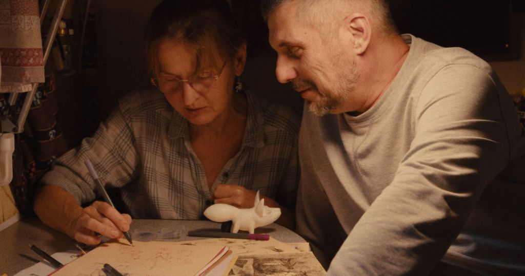 The latest documentary from Ukraine is mainly about a woman. Anya, Man A drey, and their little dog Frodo. The film is mainly shot by men and women who are featured in it . This documentary goes back and forth between the lives of this trio and what they do, which involves carvings of porcelain into beautiful artifacts and real-time war scenes. Featuring a group of average men turned into soldiers.