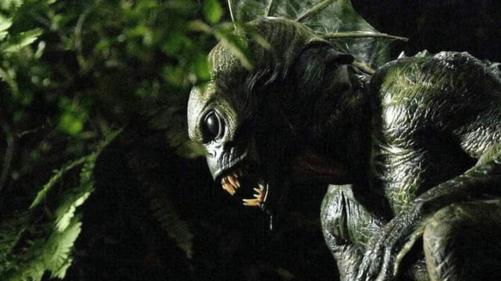 As these two men were on opposing sides of the war they don’t trust each other very much, but when they start to come under attack from multiple directions and that they are tied together they reluctantly start to work together to try and survive. They are both captured by Japanese Soldiers who made it ashore using life jackets, but there is an even deadlier force on this island that is much more threatening to all of them. And that is monsters that look like a mix between Predators and the Creature From the Black Lagoon. When the monsters get close, they even make Predator-esque sounds. They have very long sharp teeth and claws to match. These are pretty interesting looking creatures. I sure as hell wouldn’t want to come face to face with them, that’s for sure. They were creepy.