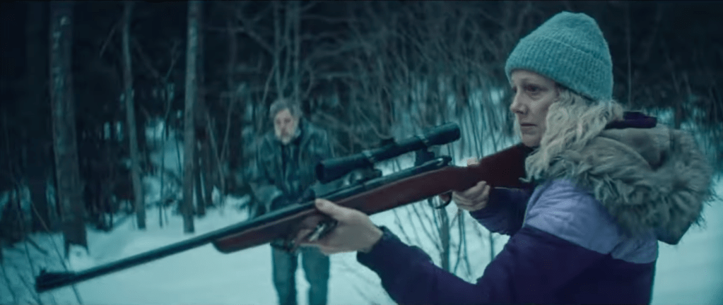 Barb (Emma Thompson) is a grieving widow living in Minnesota.  She owned a bait and tackle shop with her husband before he passed away. As a ritual, they used to do some ice fishing, so she chose to continue the long tradition. She heads to Lake Hildar. She gets a bit lost and has to stop off and ask for directions. She ends up at a house with a strange bearded man with sunglasses played by Marc Manchaca. He gives her directions, but once she’s there, she notices gunshots in the distance and a young girl running away from the man she talked to not long before. She then realizes there is more going on with this man and the house she was at than meets the eye.